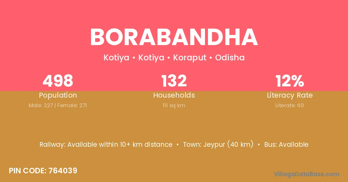 Jeypur (40 km) is the nearest town to Borabandha village for major economic activities and is located approximately 40 km away.