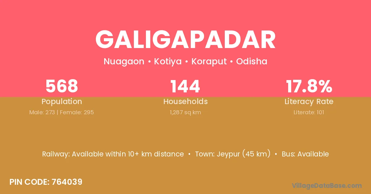 Jeypur (45 km) is the nearest town to Galigapadar village for major economic activities and is located approximately 45 km away.