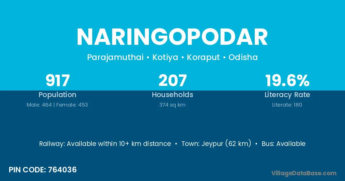 Jeypur (62 km) is the nearest town to Naringopodar village for major economic activities and is located approximately 62 km away.
