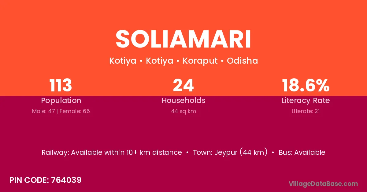 Soliamari village has a total population of 113 people, of which 47 are males and 66 are females.