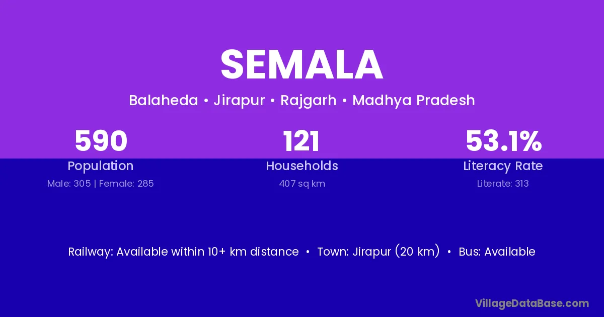 The literacy rate of Semala village is 39.05%. Male literacy stands at 46.95% and female literacy at 31.18%.