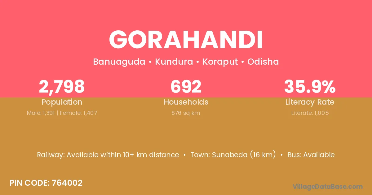 Sunabeda (16 km) is the nearest town to Gorahandi village for major economic activities and is located approximately 16 km away.