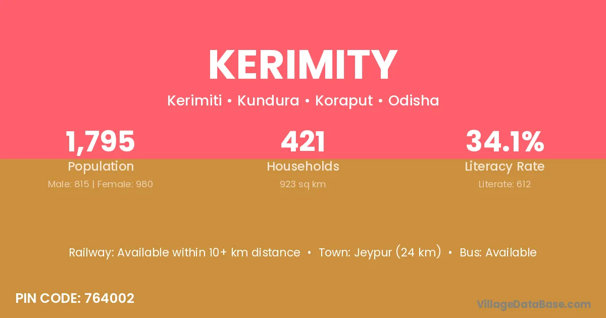 Jeypur (24 km) is the nearest town to Kerimity village for major economic activities and is located approximately 24 km away.