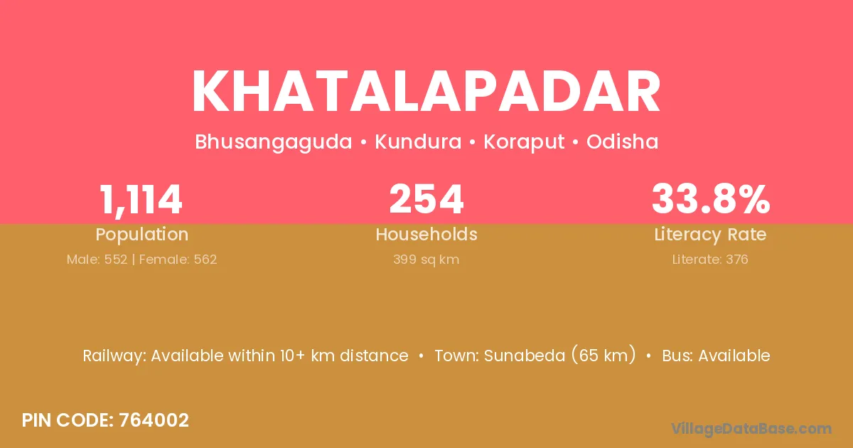 Sunabeda (65 km) is the nearest town to Khatalapadar village for major economic activities and is located approximately 65 km away.