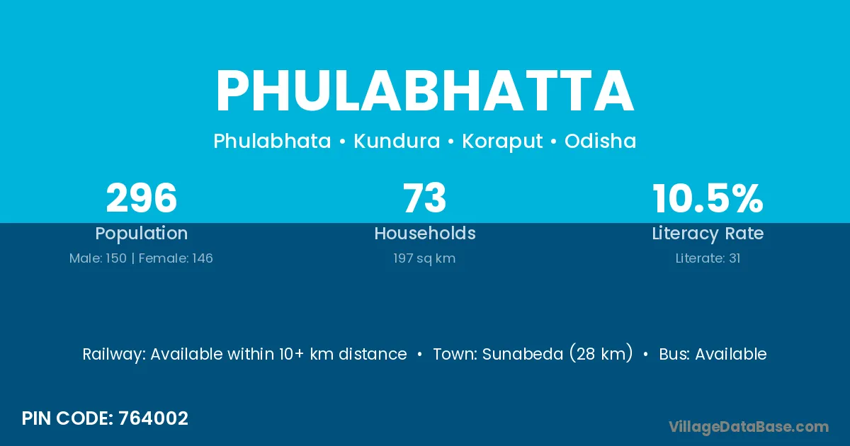 Sunabeda (28 km) is the nearest town to Phulabhatta village for major economic activities and is located approximately 28 km away.
