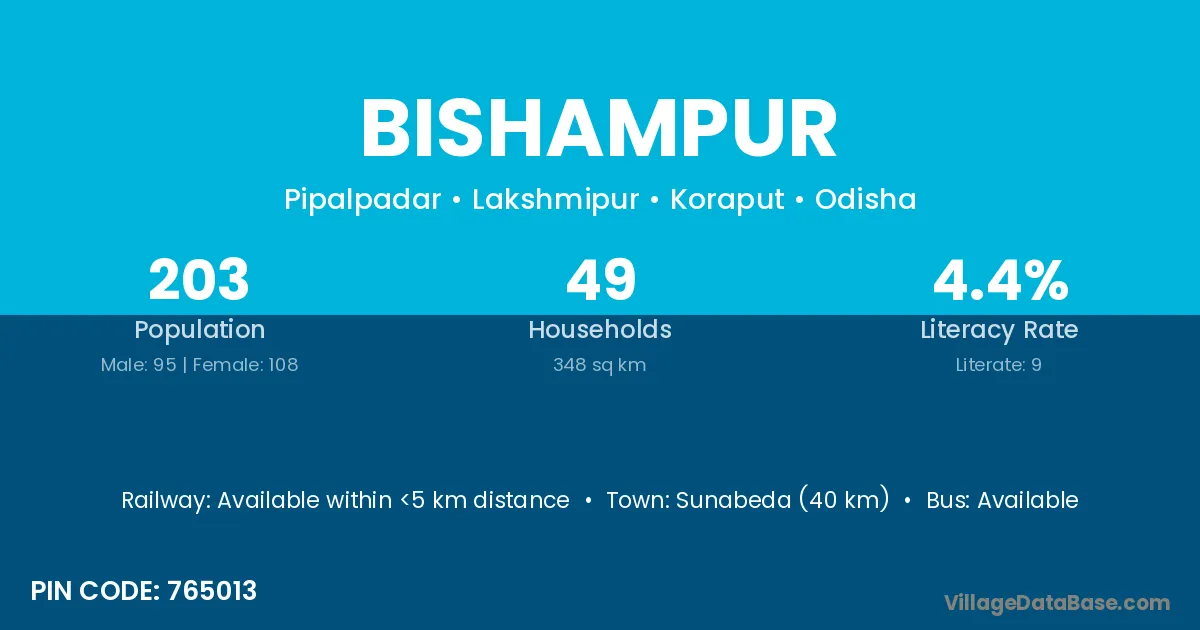 Sunabeda (40 km) is the nearest town to Bishampur village for major economic activities and is located approximately 40 km away.