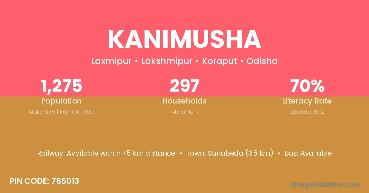 Sunabeda (35 km) is the nearest town to Kanimusha village for major economic activities and is located approximately 35 km away.
