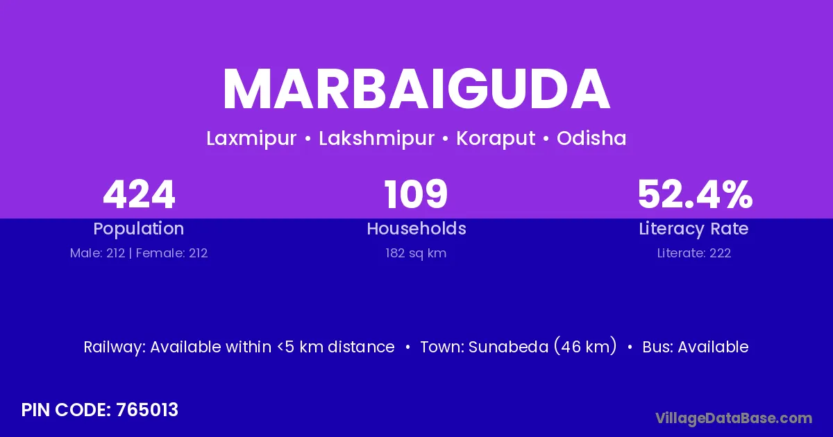 Marbaiguda village has a total population of 424 people, of which 212 are males and 212 are females.