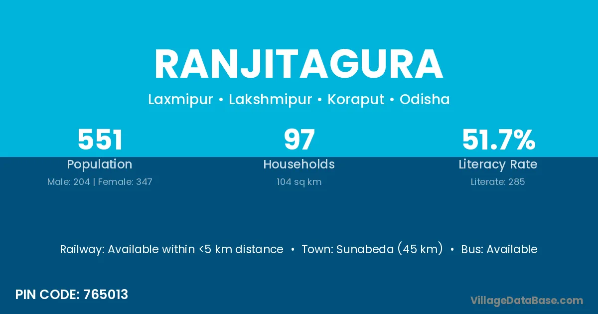 Sunabeda (45 km) is the nearest town to Ranjitagura village for major economic activities and is located approximately 45 km away.