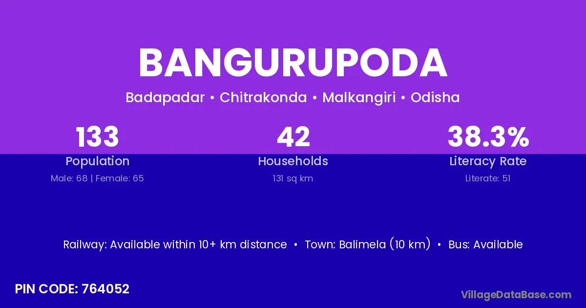 Jeypur (32 km) is the nearest town to Bangurupoda village for major economic activities and is located approximately 32 km away.