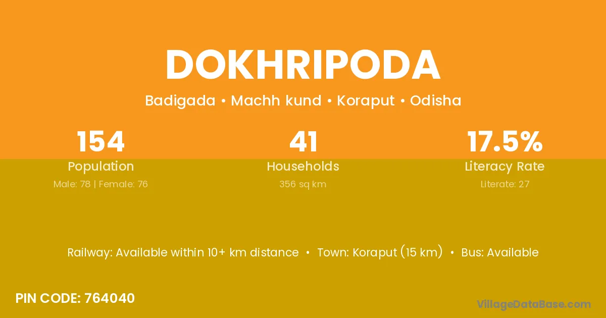 Koraput (15 km) is the nearest town to Dokhripoda village for major economic activities and is located approximately 15 km away.