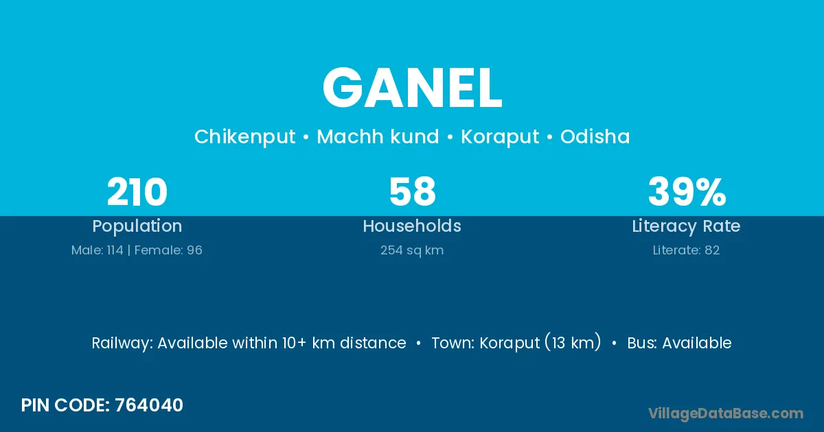 Koraput (13 km) is the nearest town to Ganel village for major economic activities and is located approximately 13 km away.