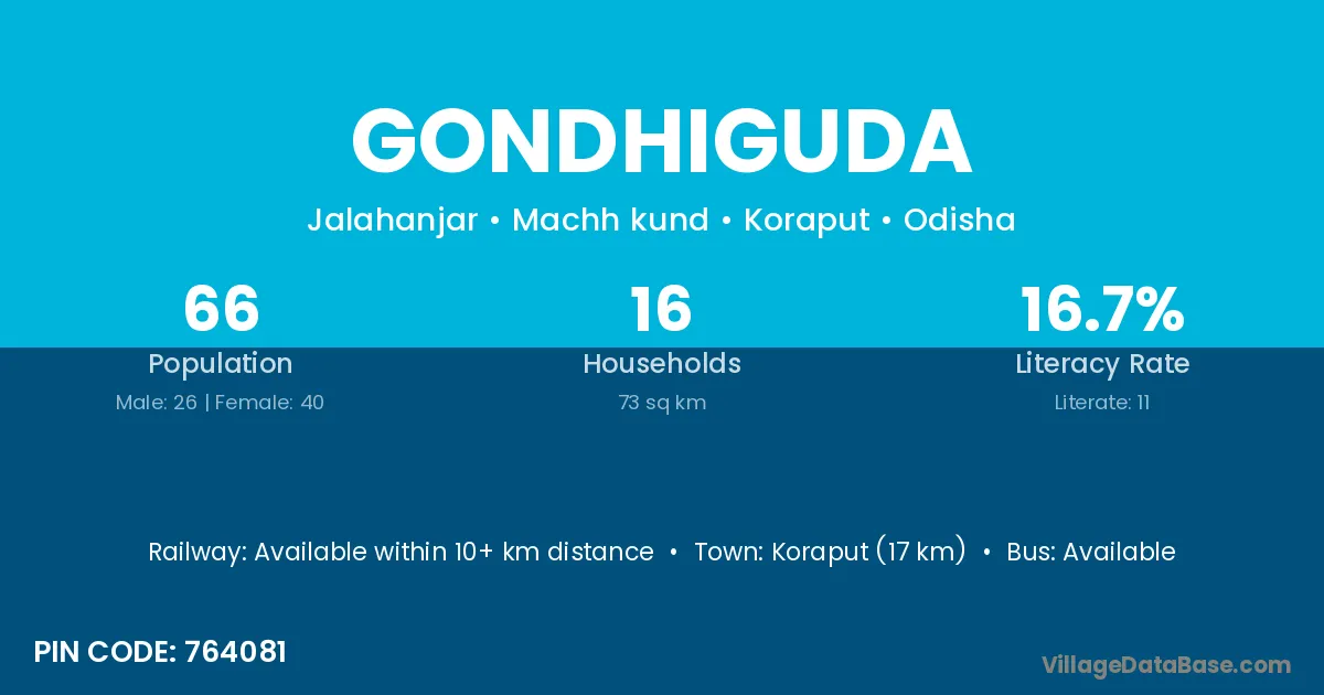 Koraput (17 km) is the nearest town to Gondhiguda village for major economic activities and is located approximately 17 km away.