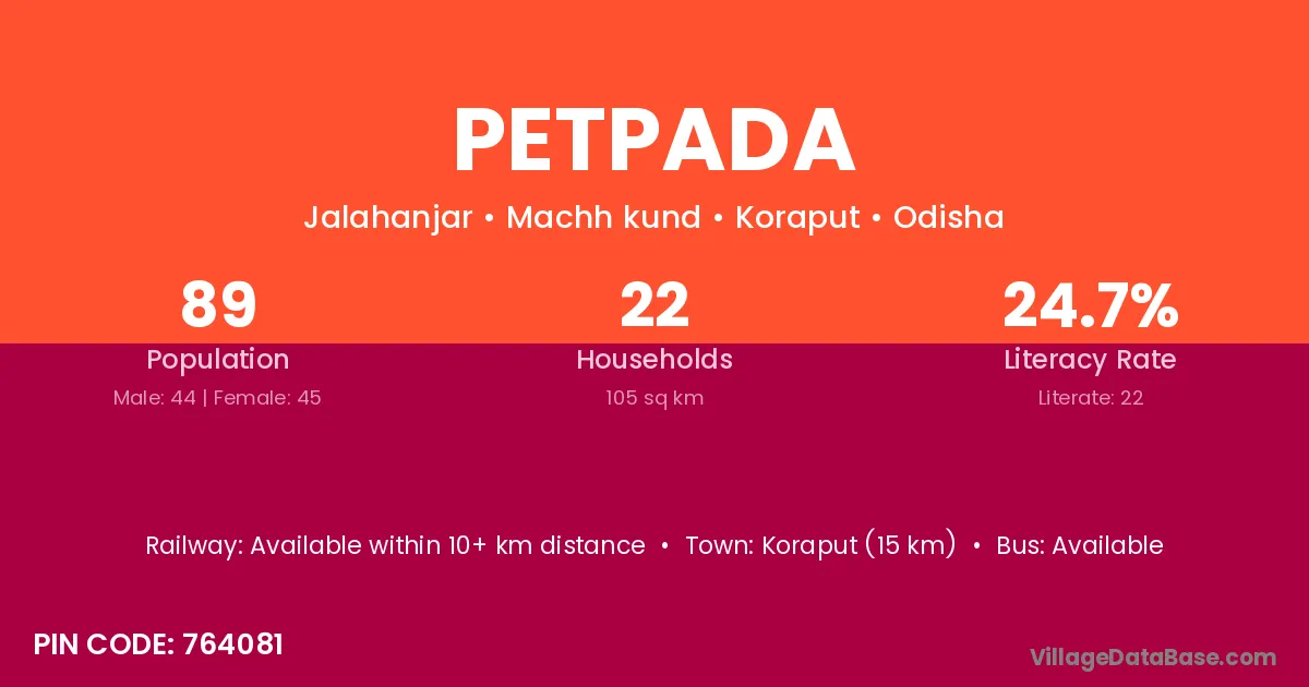 Koraput (15 km) is the nearest town to Petpada village for major economic activities and is located approximately 15 km away.