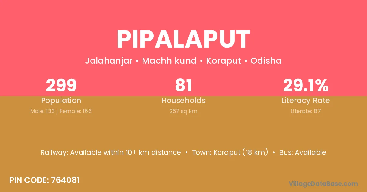 Koraput (18 km) is the nearest town to Pipalaput village for major economic activities and is located approximately 18 km away.