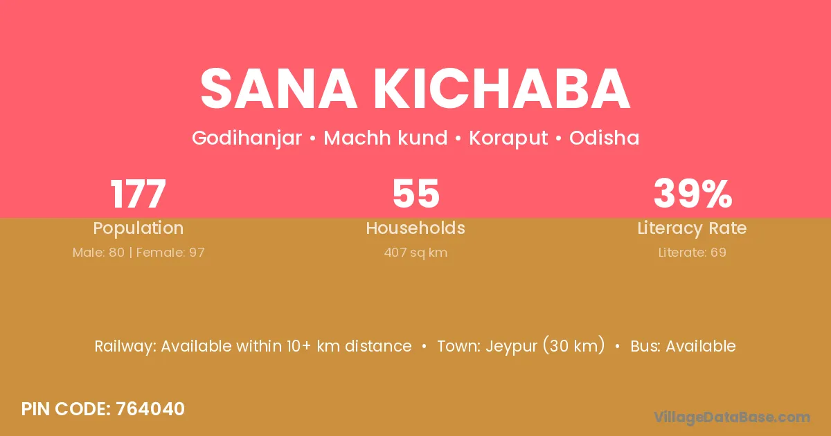 Jeypur (30 km) is the nearest town to Sana Kichaba village for major economic activities and is located approximately 30 km away.
