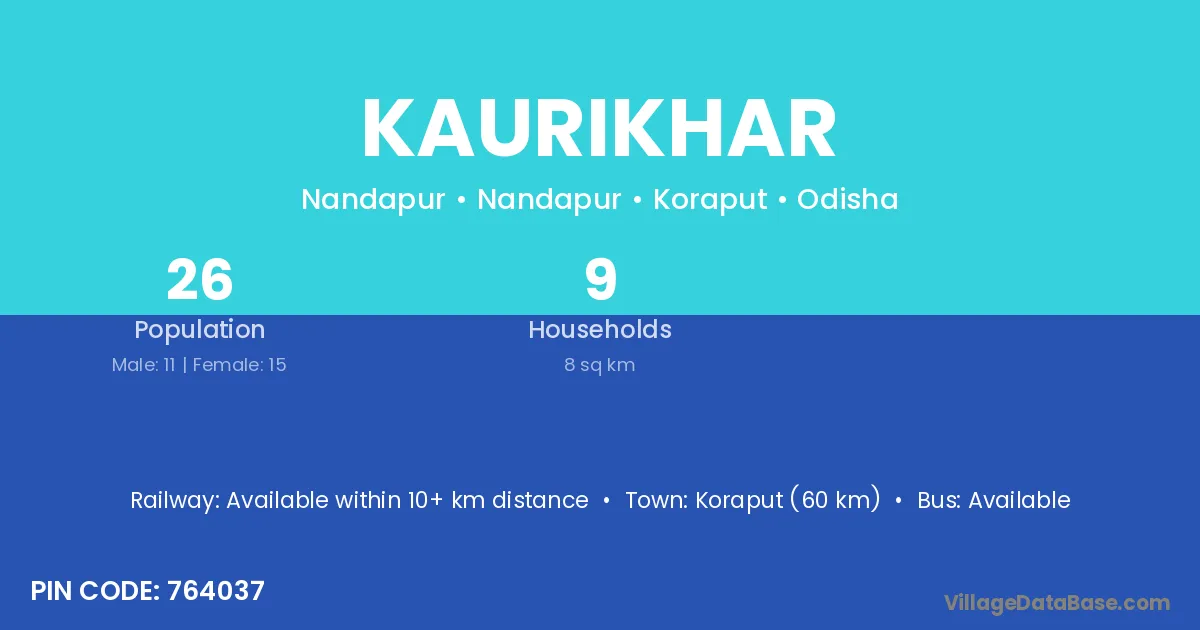 Koraput (60 km) is the nearest town to Kaurikhar village for major economic activities and is located approximately 60 km away.
