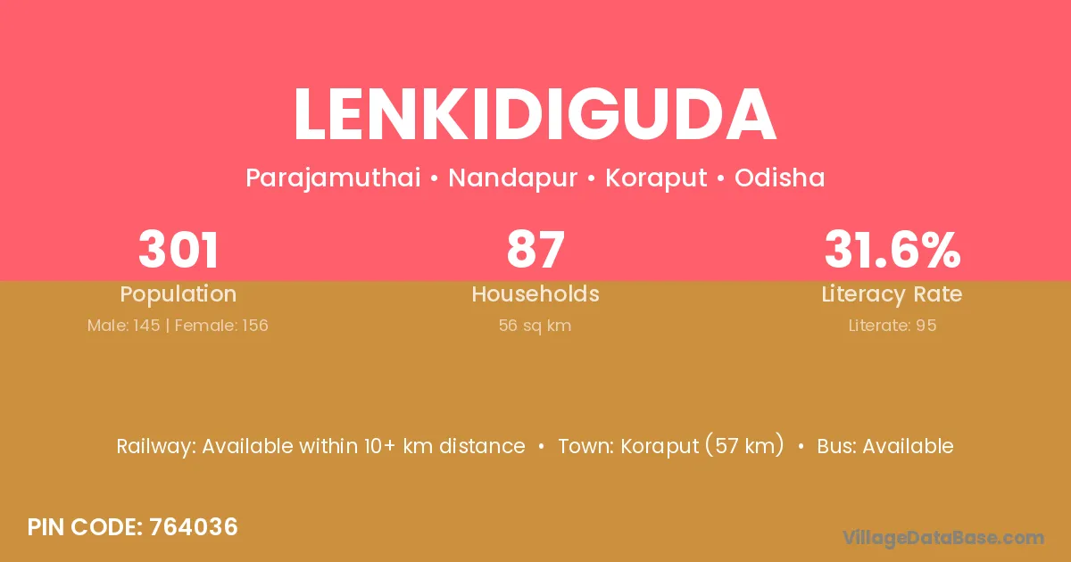 Lenkidiguda village has a total population of 301 people, of which 145 are males and 156 are females.