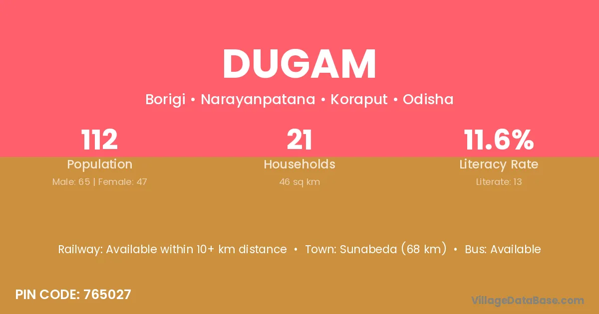 Sunabeda (68 km) is the nearest town to Dugam village for major economic activities and is located approximately 68 km away.