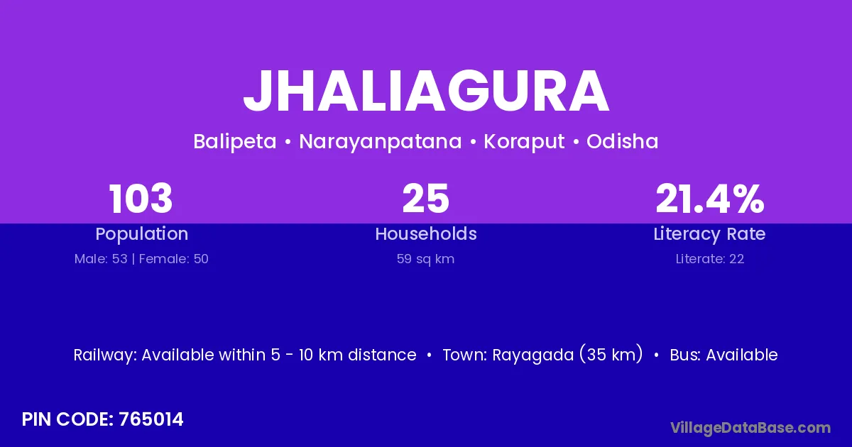 Rayagada (35 km) is the nearest town to Jhaliagura village for major economic activities and is located approximately 35 km away.