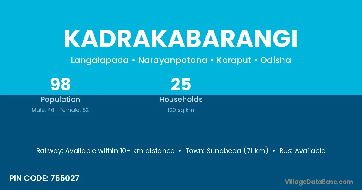 Sunabeda (71 km) is the nearest town to Kadrakabarangi village for major economic activities and is located approximately 71 km away.