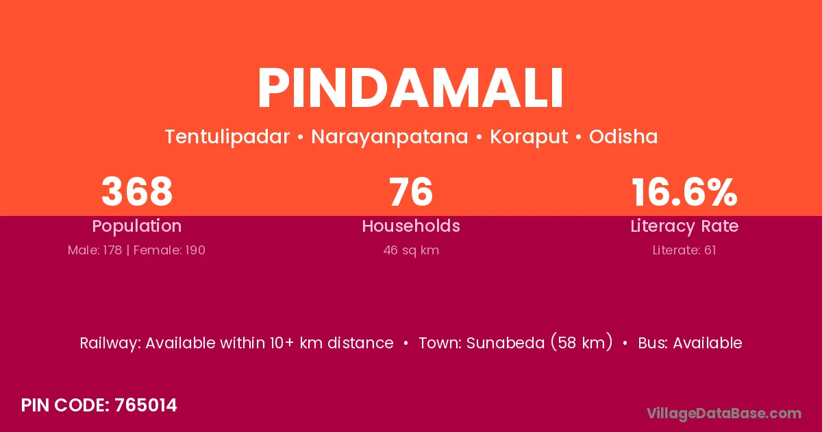 Pindamali village has a total population of 368 people, of which 178 are males and 190 are females.