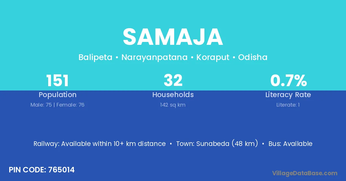 Sunabeda (48 km) is the nearest town to Samaja village for major economic activities and is located approximately 48 km away.