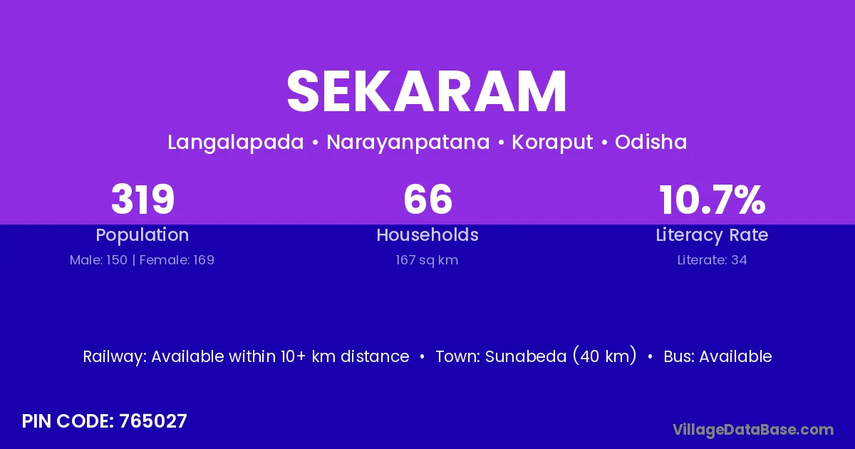 Sunabeda (40 km) is the nearest town to Sekaram village for major economic activities and is located approximately 40 km away.