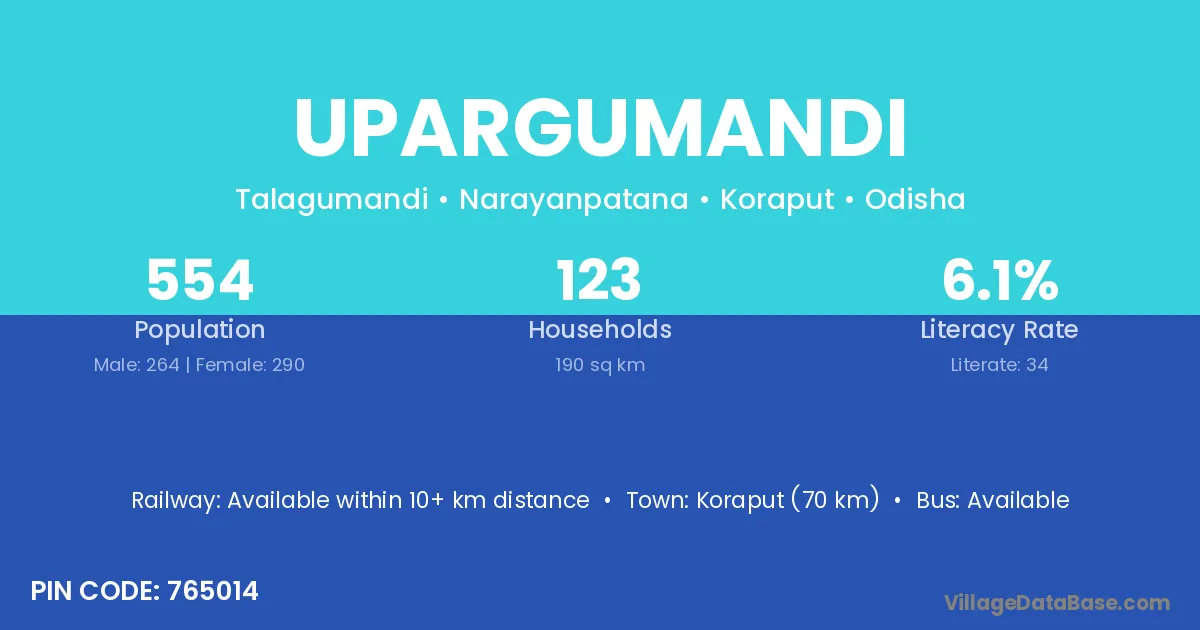 Koraput (70 km) is the nearest town to Upargumandi village for major economic activities and is located approximately 70 km away.