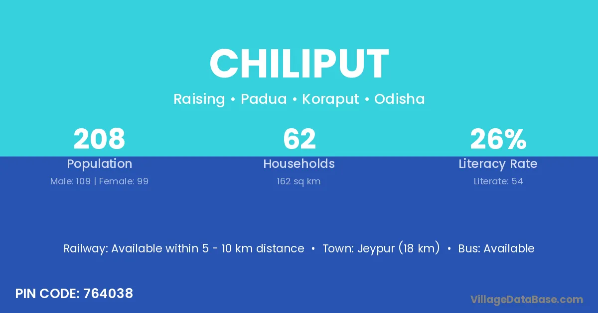 Jeypur (18 km) is the nearest town to Chiliput village for major economic activities and is located approximately 18 km away.