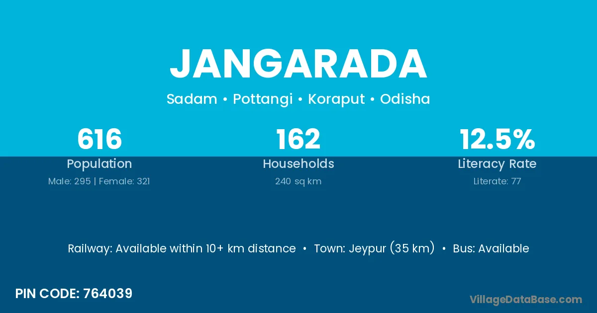 Jeypur (35 km) is the nearest town to Jangarada village for major economic activities and is located approximately 35 km away.
