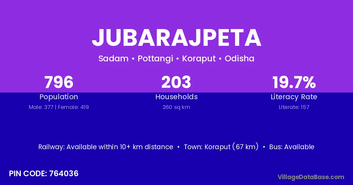 Koraput (67 km) is the nearest town to Jubarajpeta village for major economic activities and is located approximately 67 km away.