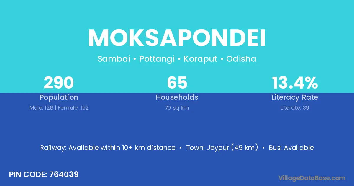 Jeypur (49 km) is the nearest town to Moksapondei village for major economic activities and is located approximately 49 km away.