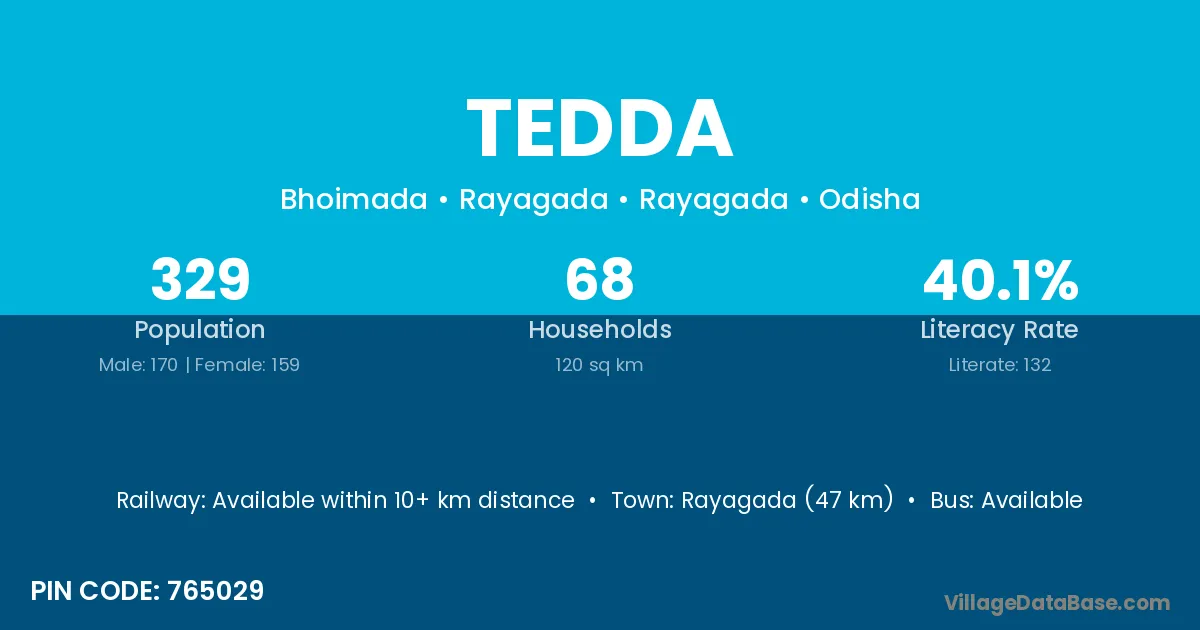 The literacy rate of Tedda village is 18.18%. Male literacy stands at 26.92% and female literacy at 10.34%.