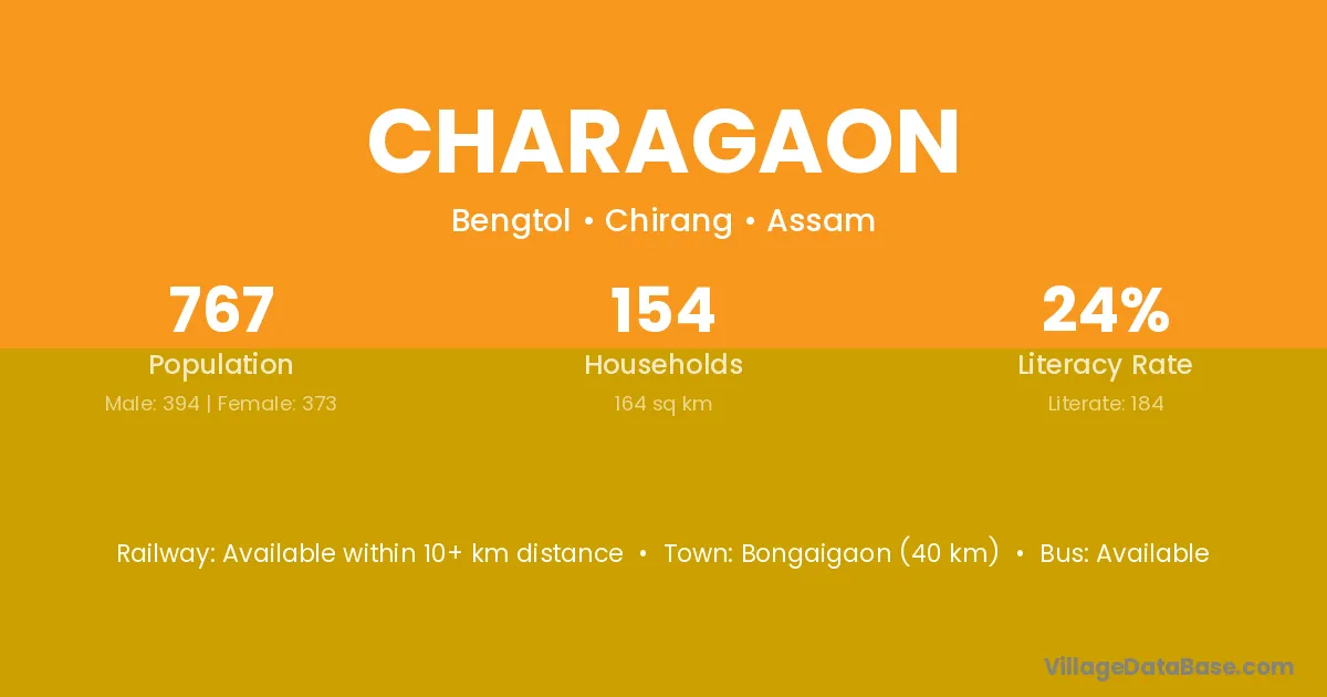 The literacy rate of Charagaon village is 38.92%. Male literacy stands at 51.29% and female literacy at 28.40%.