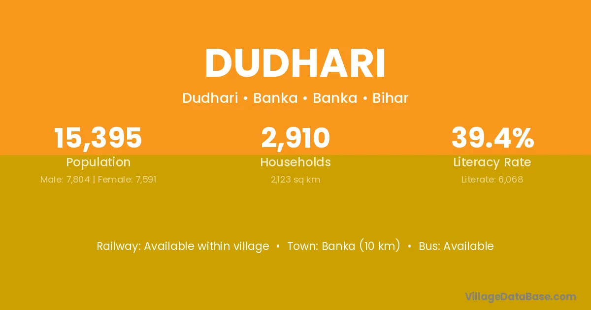 The literacy rate of Dudhari village is 33.90%. Male literacy stands at 47.30% and female literacy at 21.07%.