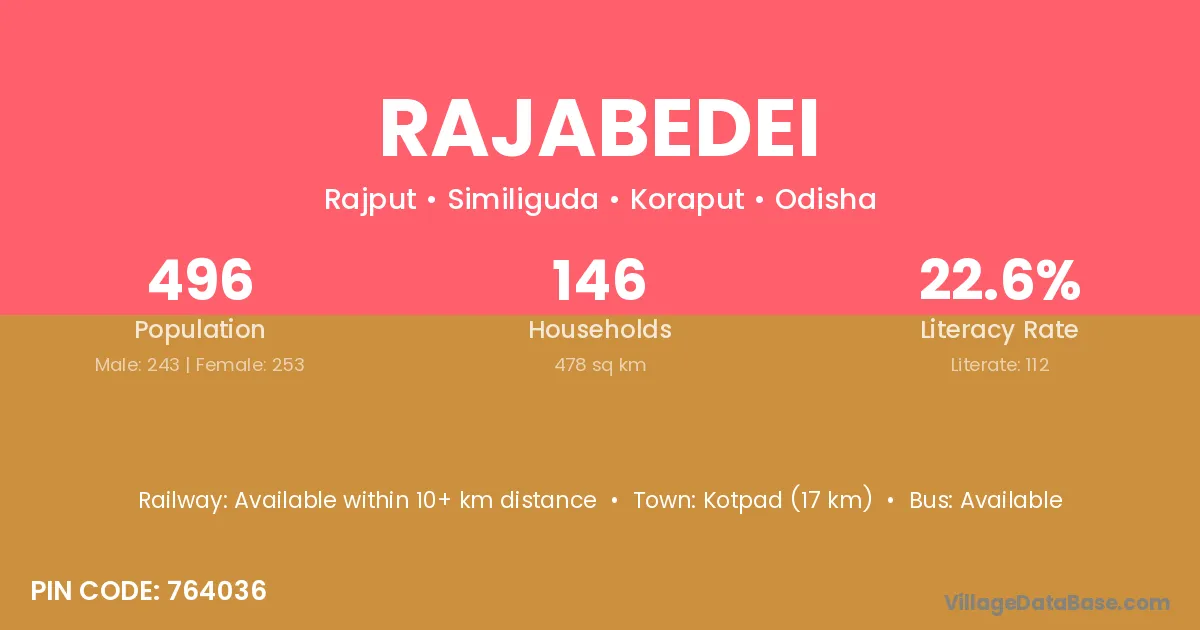 Kotpad (17 km) is the nearest town to Rajabedei village for major economic activities and is located approximately 17 km away.