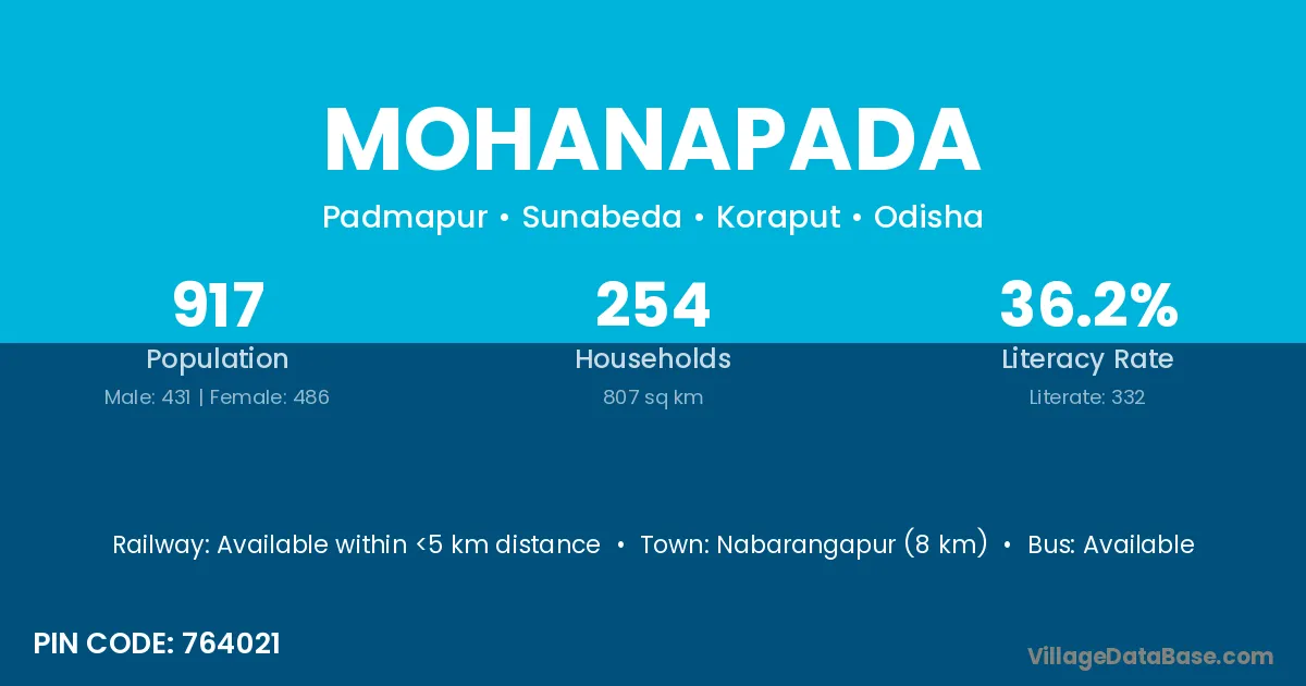 Nabarangapur (8 km) is the nearest town to Mohanapada village for major economic activities and is located approximately 8 km away.