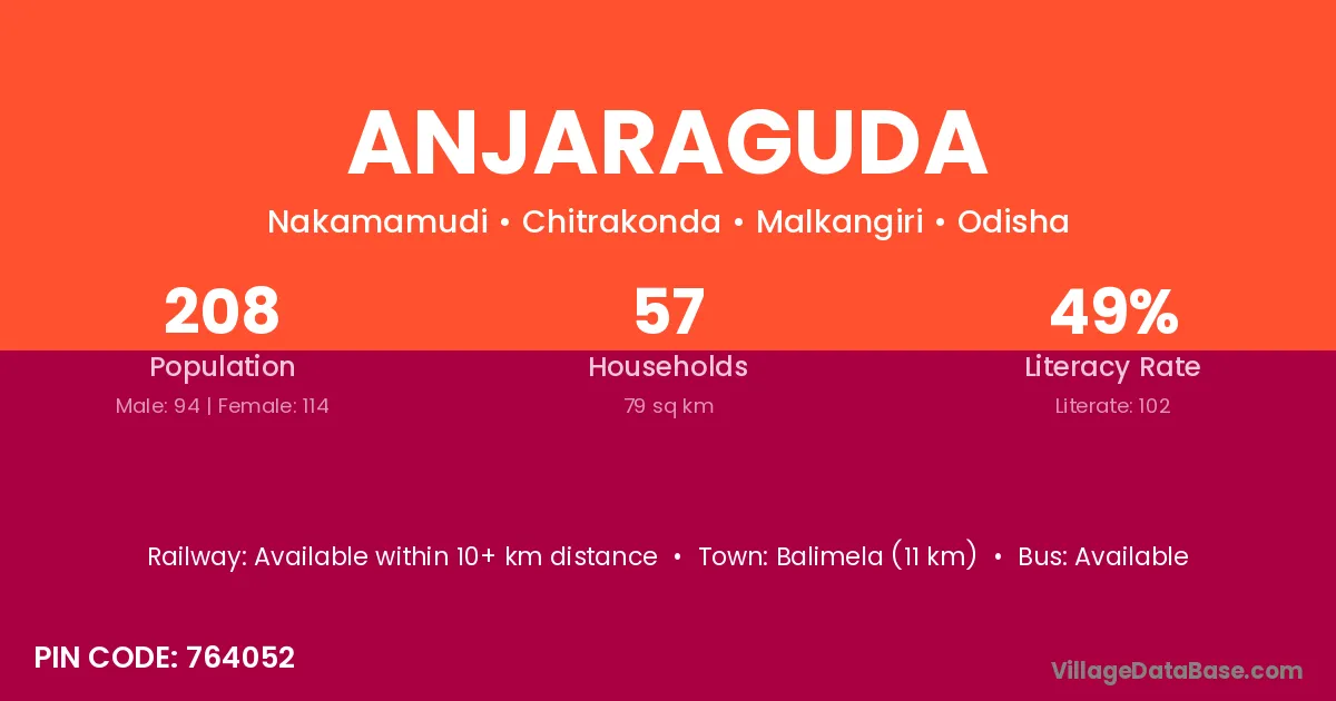 Balimela (11 km) is the nearest town to Anjaraguda village for major economic activities and is located approximately 11 km away.