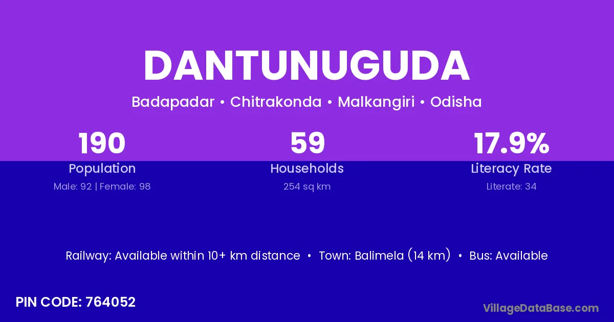 Dantunuguda village is located in the Chitrakonda Tehsil of the Malkangiri district in Odisha .