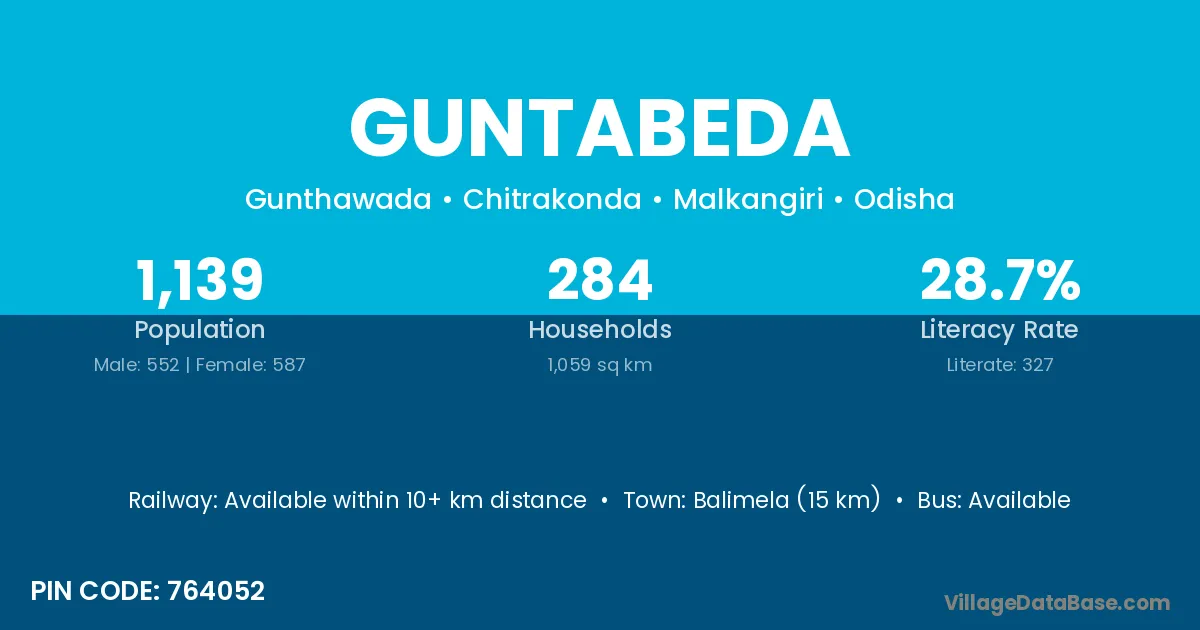 Balimela (15 km) is the nearest town to Guntabeda village for major economic activities and is located approximately 15 km away.