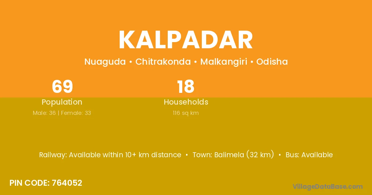 Balimela (32 km) is the nearest town to Kalpadar village for major economic activities and is located approximately 32 km away.