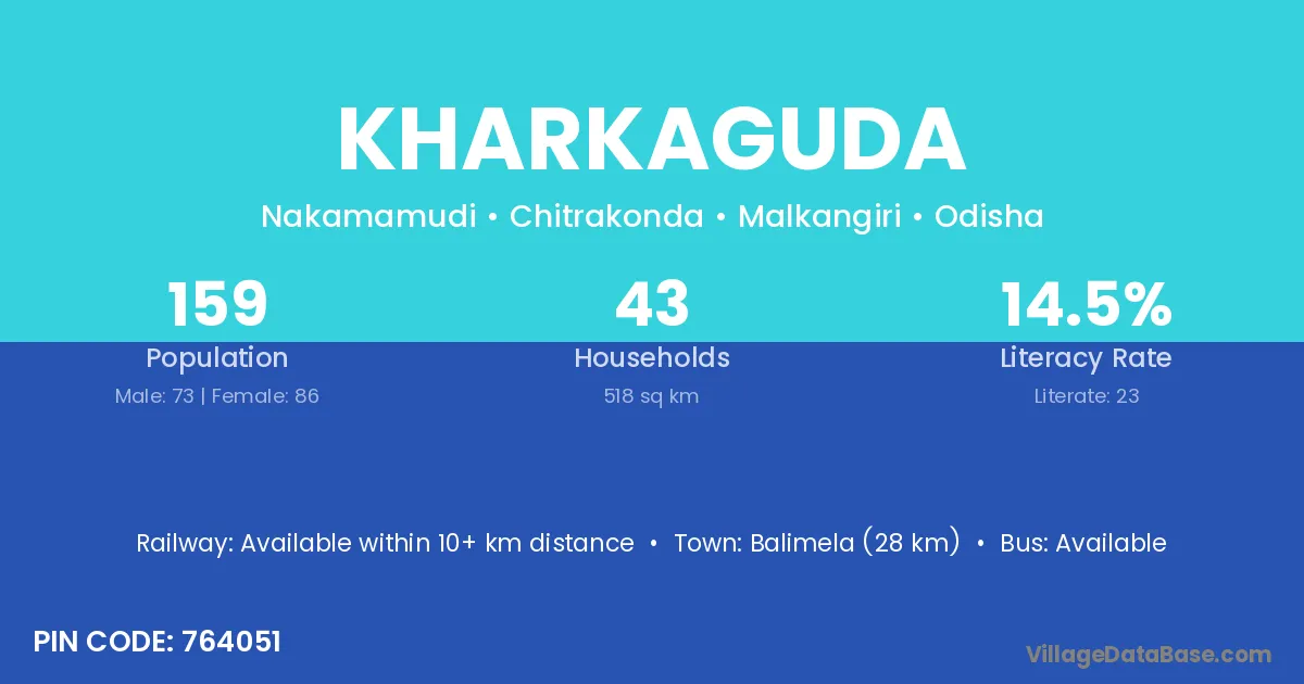 Balimela (28 km) is the nearest town to Kharkaguda village for major economic activities and is located approximately 28 km away.