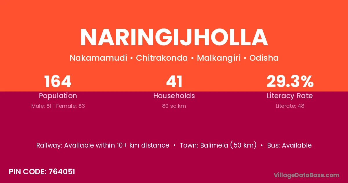 Balimela (50 km) is the nearest town to Naringijholla village for major economic activities and is located approximately 50 km away.