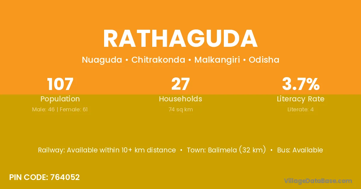 Balimela (32 km) is the nearest town to Rathaguda village for major economic activities and is located approximately 32 km away.