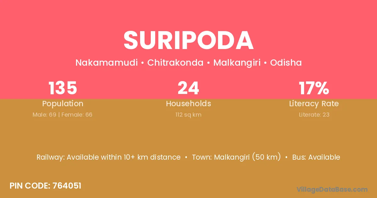 Malkangiri (50 km) is the nearest town to Suripoda village for major economic activities and is located approximately 50 km away.