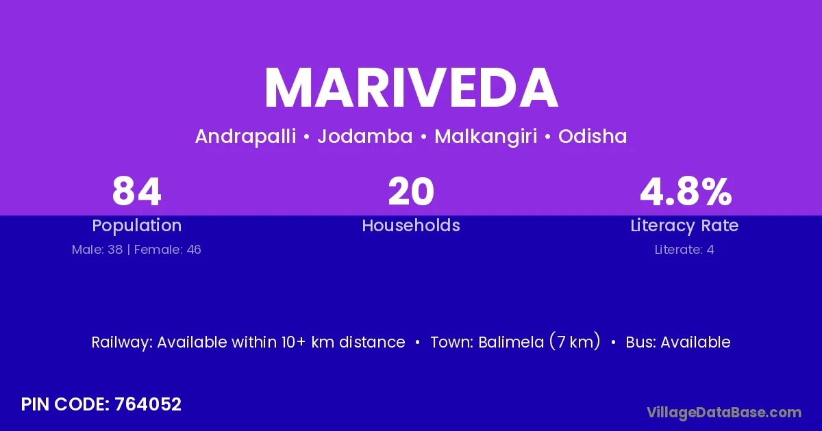 Balimela (7 km) is the nearest town to Mariveda village for major economic activities and is located approximately 7 km away.