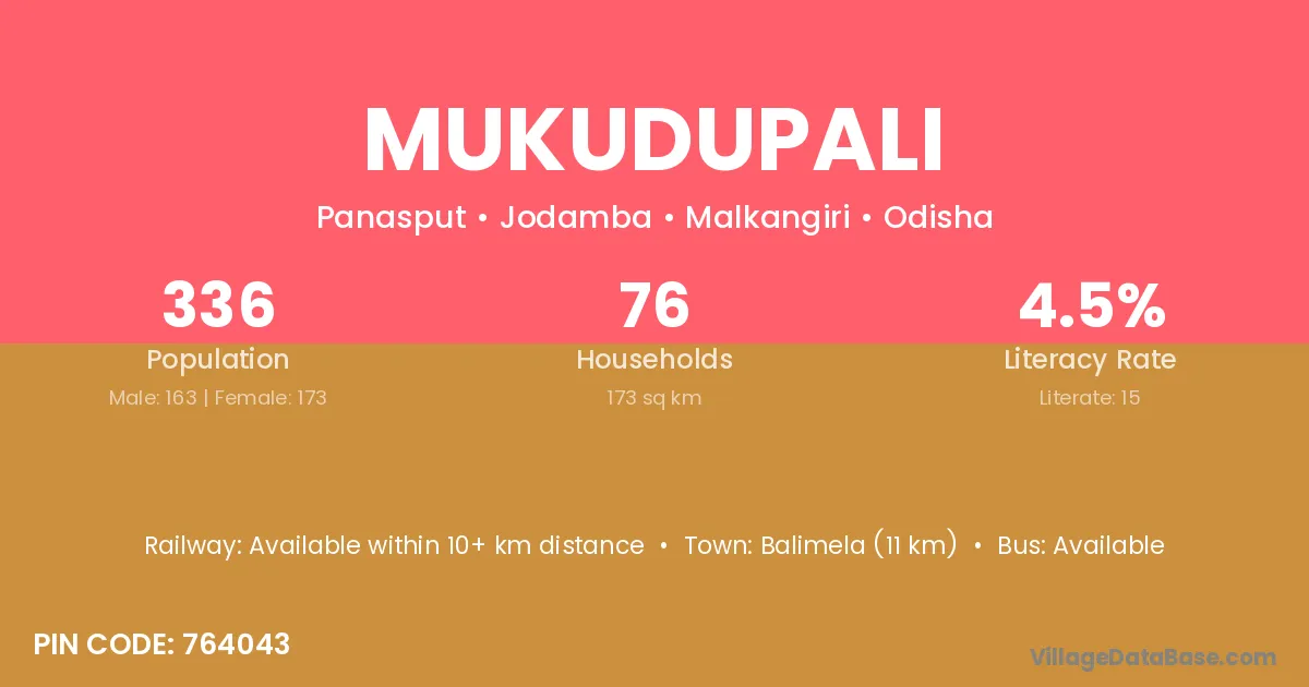 Mukudupali village has a total population of 336 people, of which 163 are males and 173 are females.