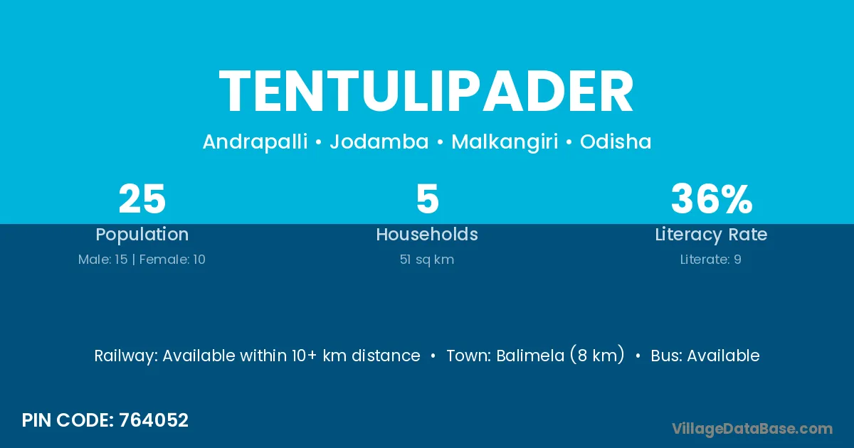 Balimela (8 km) is the nearest town to Tentulipader village for major economic activities and is located approximately 8 km away.
