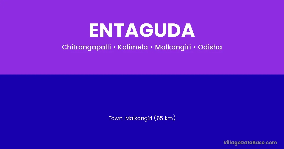 Malkangiri (65 km) is the nearest town to Entaguda village for major economic activities and is located approximately 65 km away.